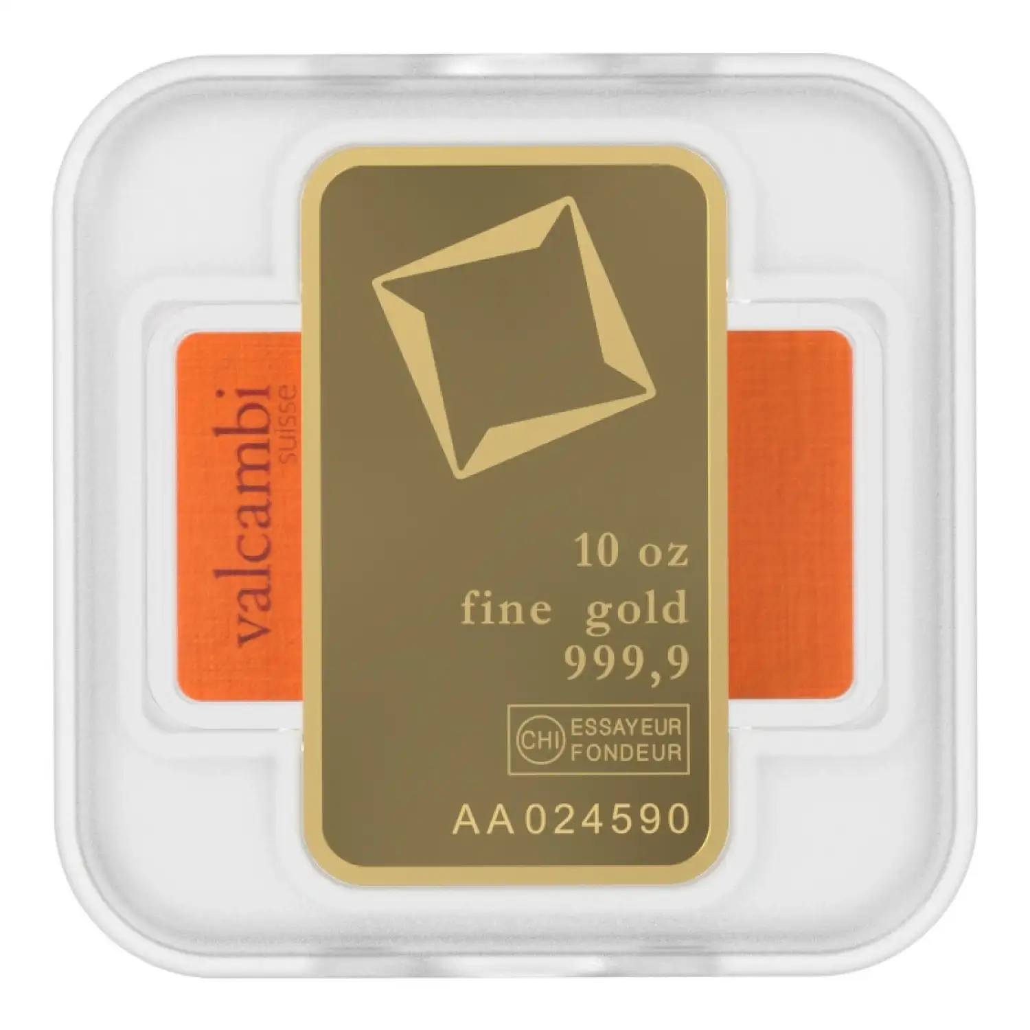 Each 10oz Valcambi Minted Gold Bar contains 10oz of .9999 pure gold, features the Valcambi corporate logo. This strikingly beautiful gold bar is designed by Valcambi Suisse.