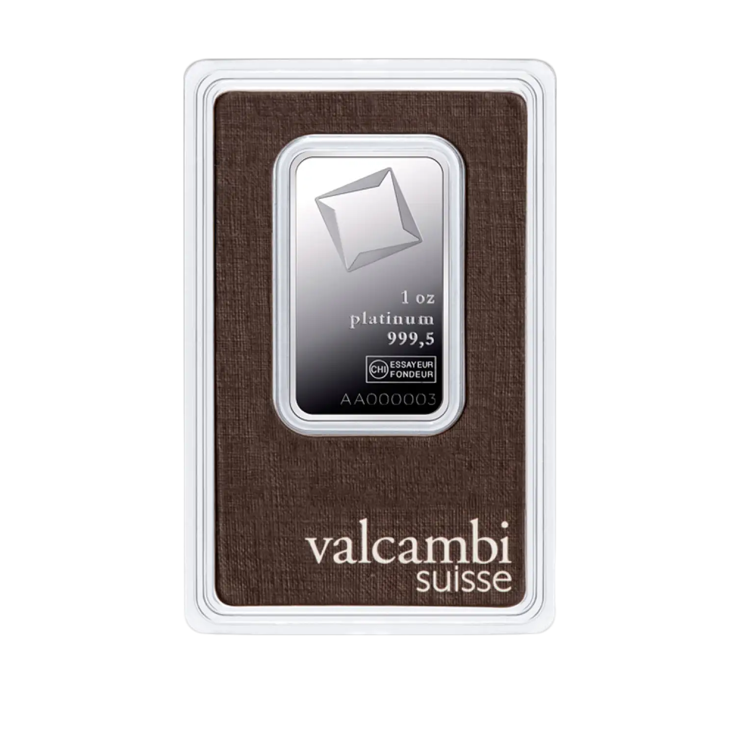 Valcambi Suisse is one of the oldest Swiss refineries, popular for minting high-quality bars. The 1oz Valcambi Minted Platinum Bar contains 1 troy ounce of .9995 pure platinum, features the Valcambi corporate logo. This strikingly beautiful platinum bar is designed by Valcambi Suisse.