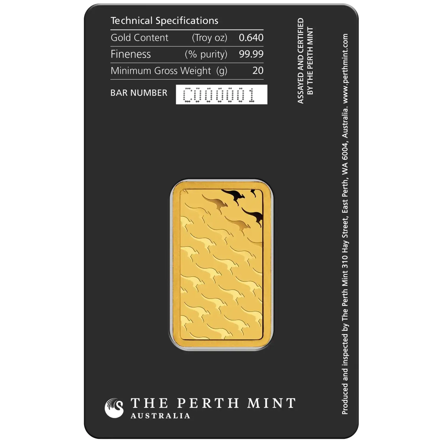 Each 20g gold bar is minted with .9999 pure gold, showcasing the Perth Mint's commitment to producing only the finest bullion products. The obverse side features the majestic swan logo of the Perth Mint, along with the bar's weight and purity. The reverse side displays a unique serial number for added security and authenticity.