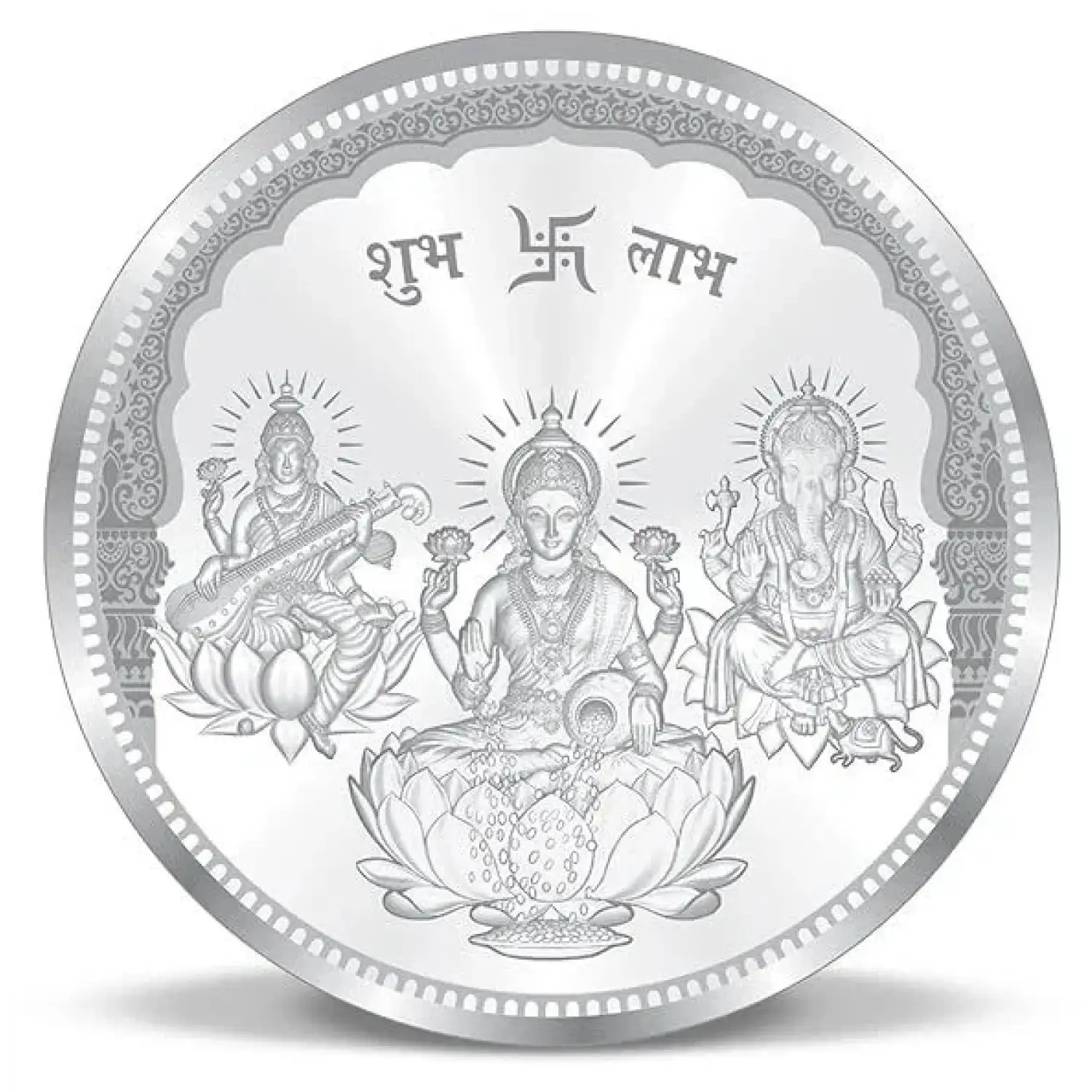 Invest in this 10g Ganesh Lakshmi & Saraswati Silver Coin today and invite prosperity and blessings into your life. Each coin comes securely packaged to preserve its pristine condition, making it a perfect choice for both investors and enthusiasts alike.