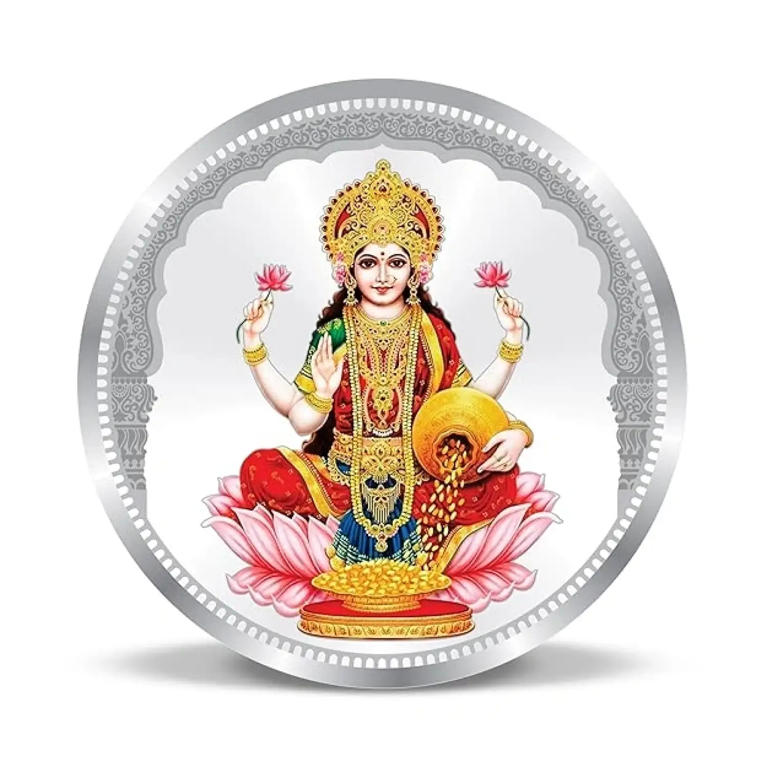 The exquisite 10g Lakshmi with Mantra Silver Color Coin is a stunning piece that beautifully combines spiritual significance with precious metal craftsmanship. This coin features a detailed image of Goddess Lakshmi, the Hindu deity of wealth and prosperity, embellished with sacred mantras to invoke blessings of abundance and fortune.