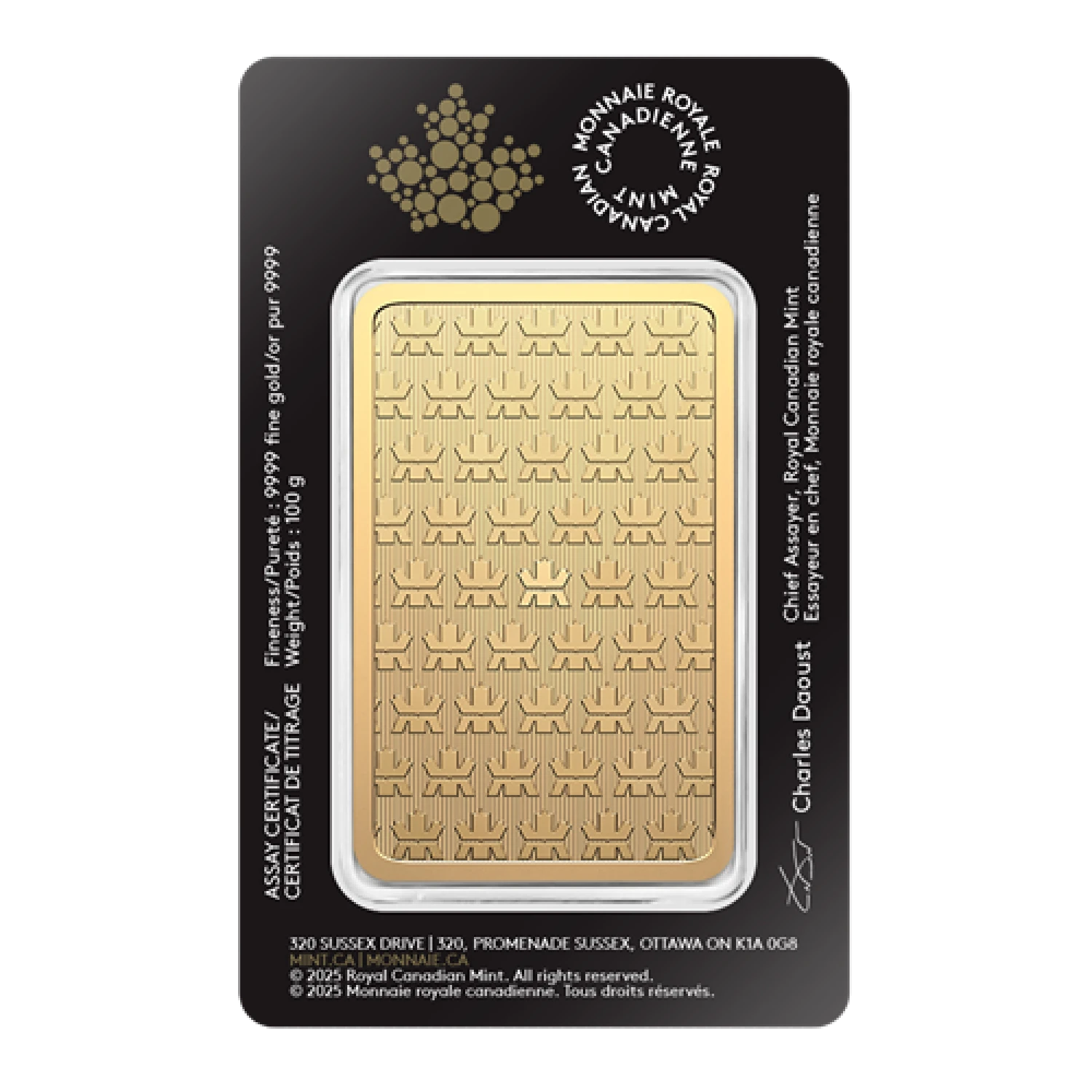 Each bar features the iconic Royal Canadian Mint logo on the obverse side, along with its weight and purity stamped for authentication. On the reverse, you'll find a repeating image of the mint's logo, providing added security against counterfeiting.