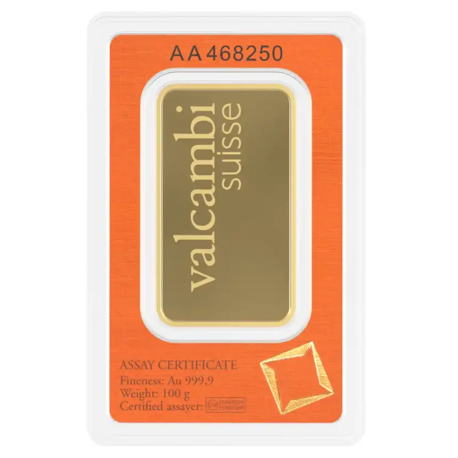 Order the high-quality 100g Valcambi Minted Gold Bar online today from us! The gold bar price is updated on our website every minute.