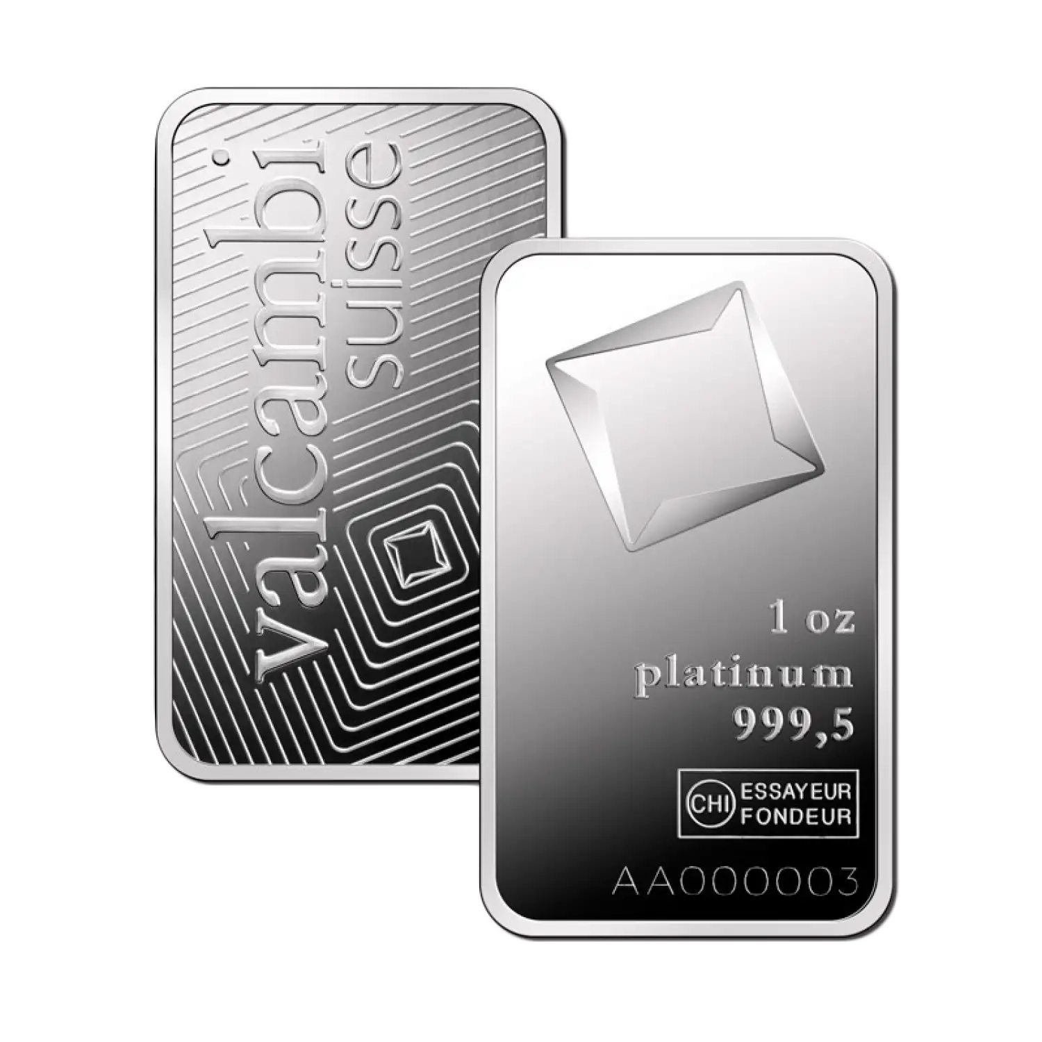 Valcambi Suisse is one of the oldest Swiss refineries, popular for minting high-quality bars. The 1oz Valcambi Minted Platinum Bar contains 1 troy ounce of .9995 pure platinum, features the Valcambi corporate logo. This strikingly beautiful platinum bar is designed by Valcambi Suisse.