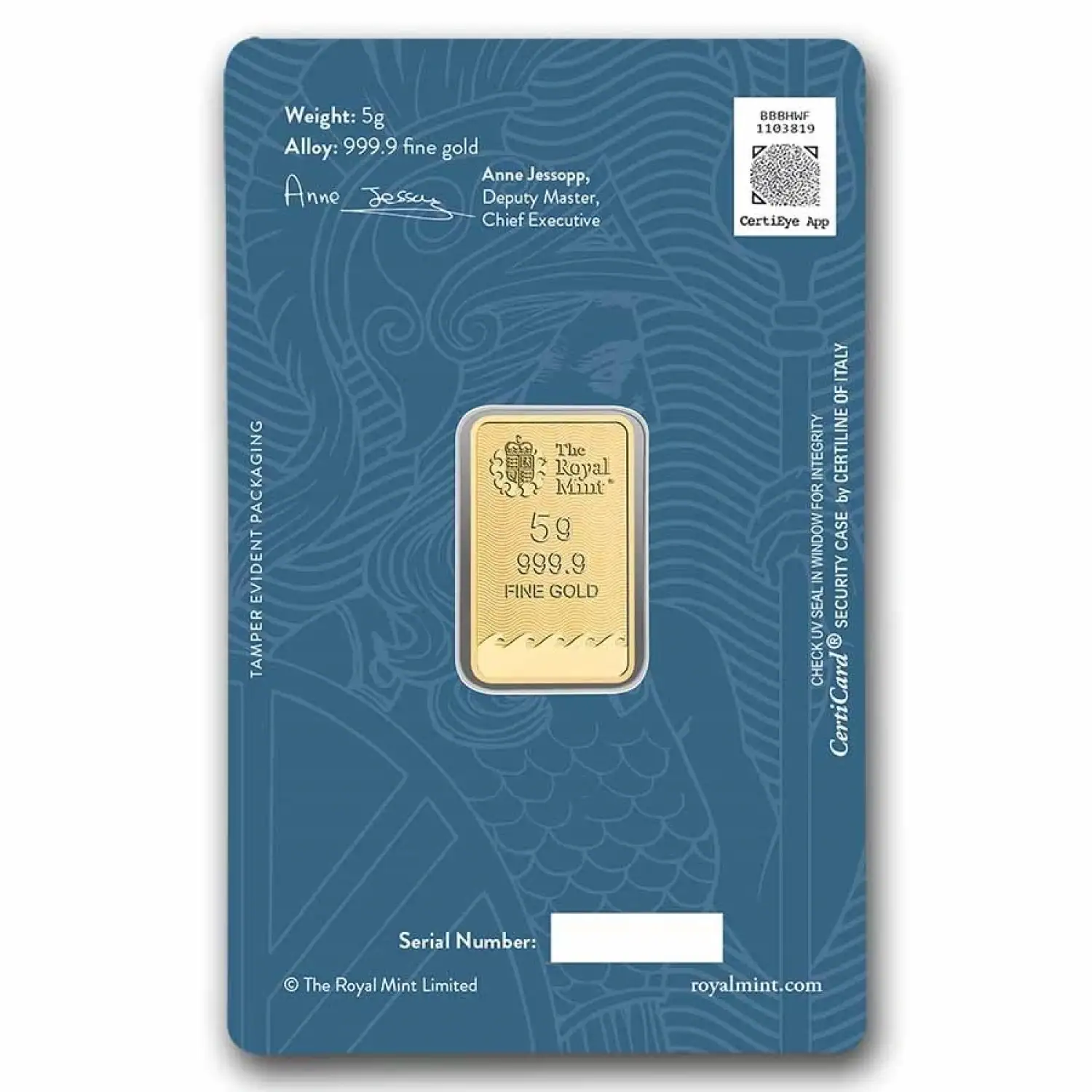 Whether you're looking to start your precious metals collection or expand your existing holdings, the 5 g Royal Mint Gold Britannia Minted Bar is a versatile option that offers both aesthetic beauty and financial security. Its IRA eligibility also makes it a convenient choice for retirement accounts, adding further value to your investment.