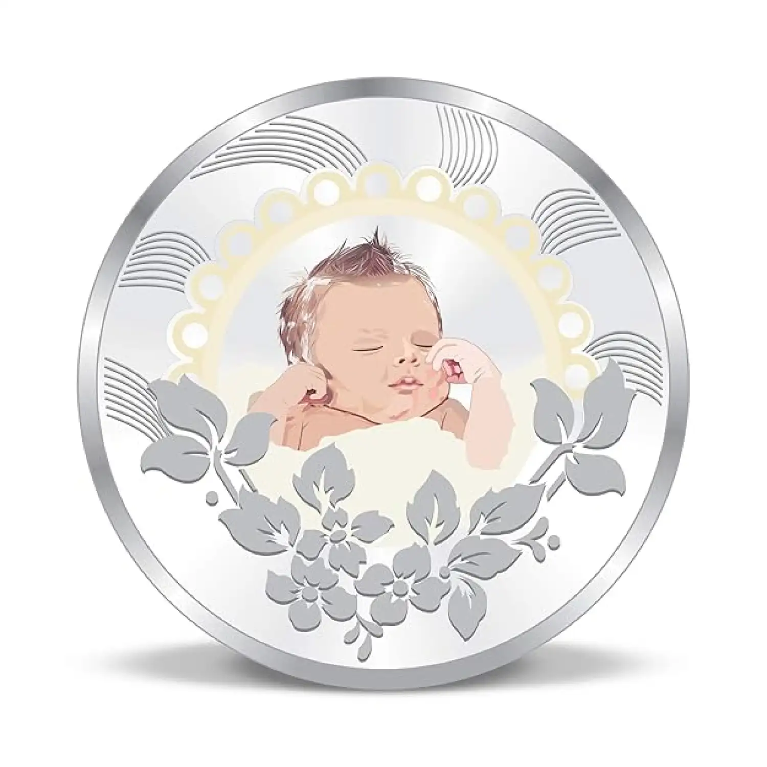 The 10g New Born Baby Silver Color Coin features a detailed design of a newborn baby, symbolizing purity, innocence, and the promise of new beginnings. This exquisite round is minted with precision and care, ensuring that every intricate detail is beautifully rendered.