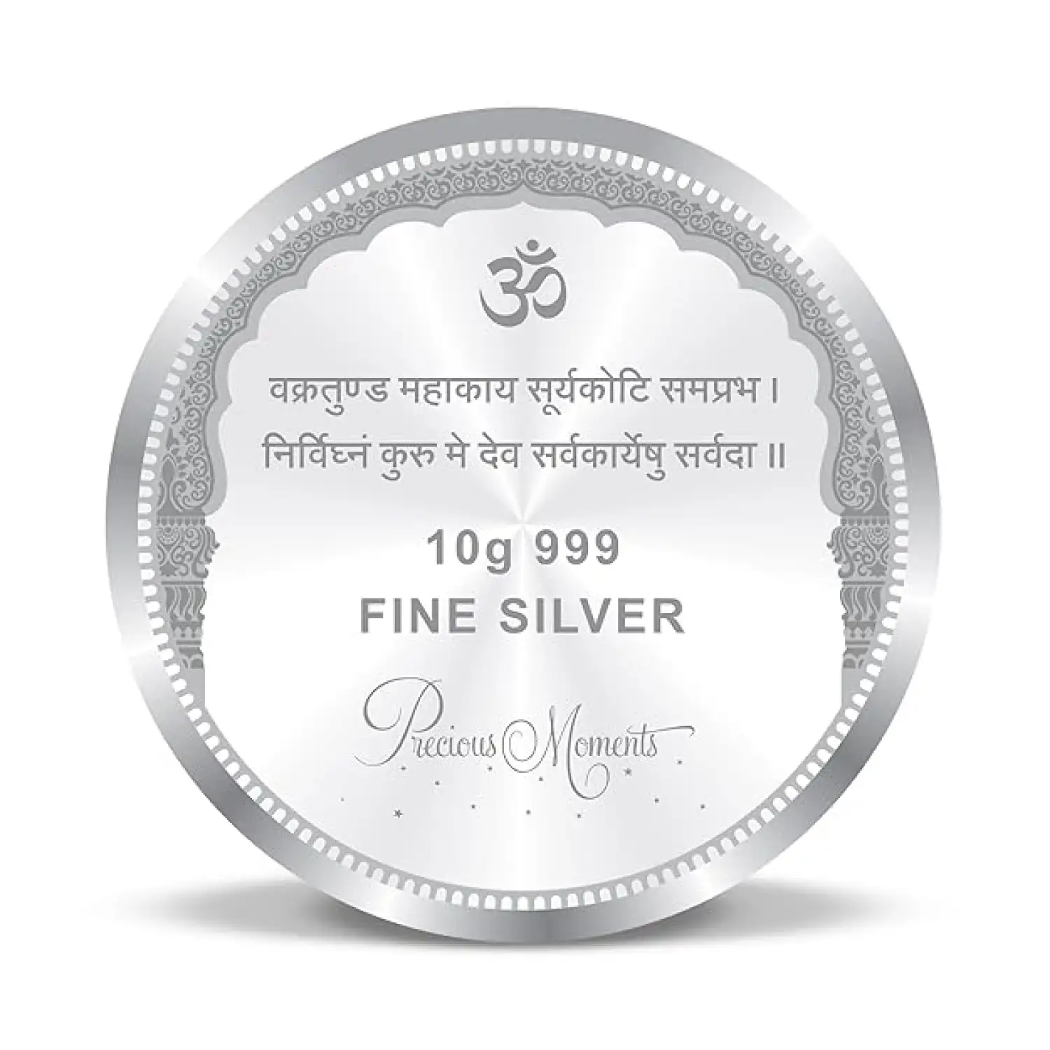 Embrace spirituality and prosperity with the beautifully crafted 10g Ganesh with Mantra Silver Color Coin. This round features an intricate design of Lord Ganesh, the remover of obstacles, along with a powerful mantra inscribed on it.