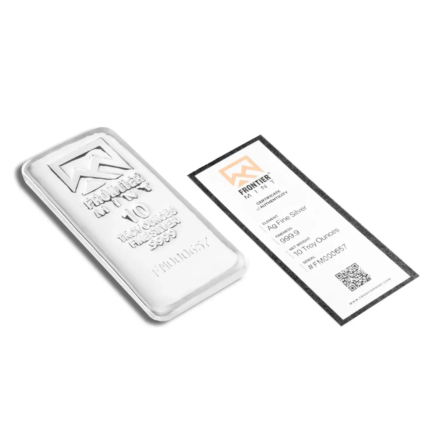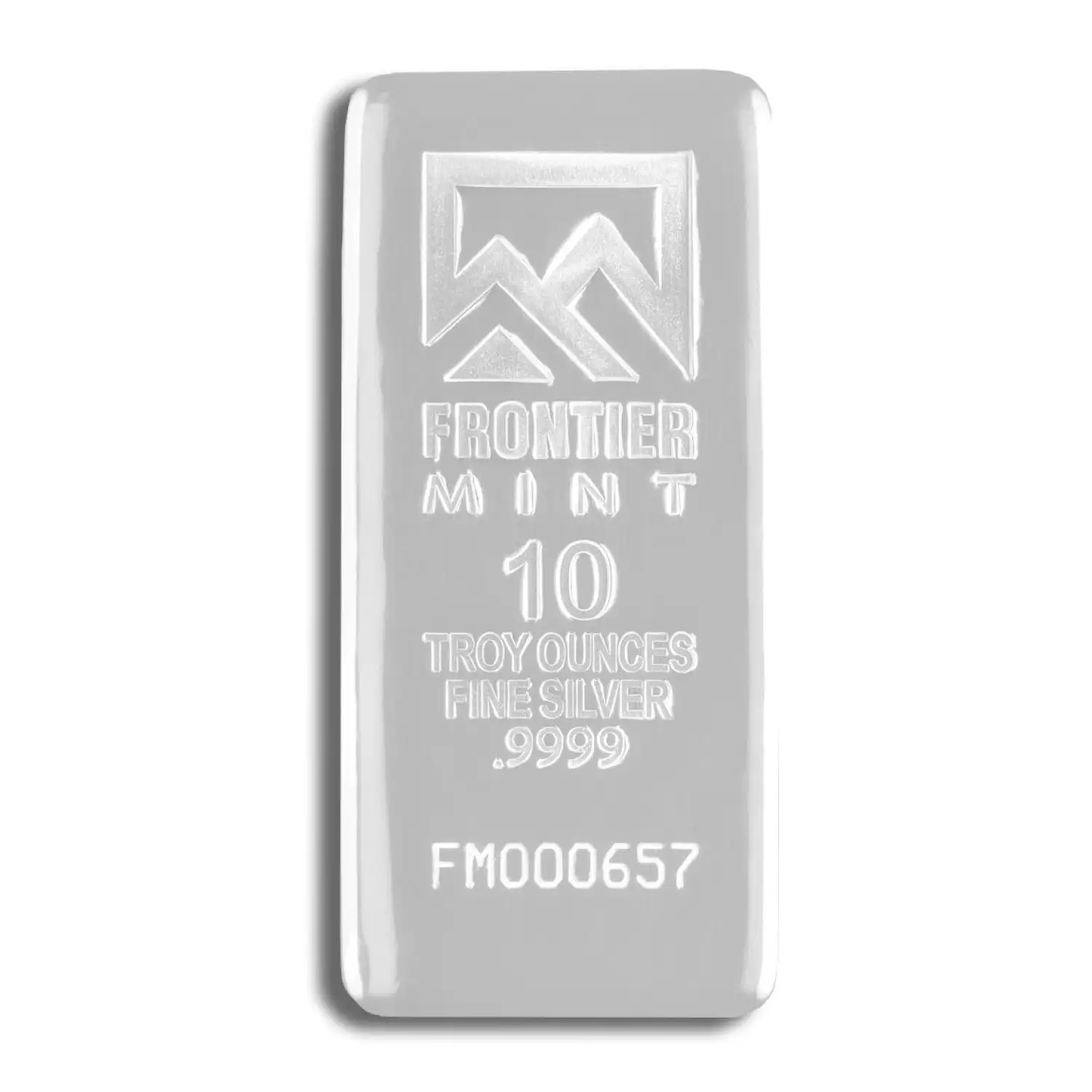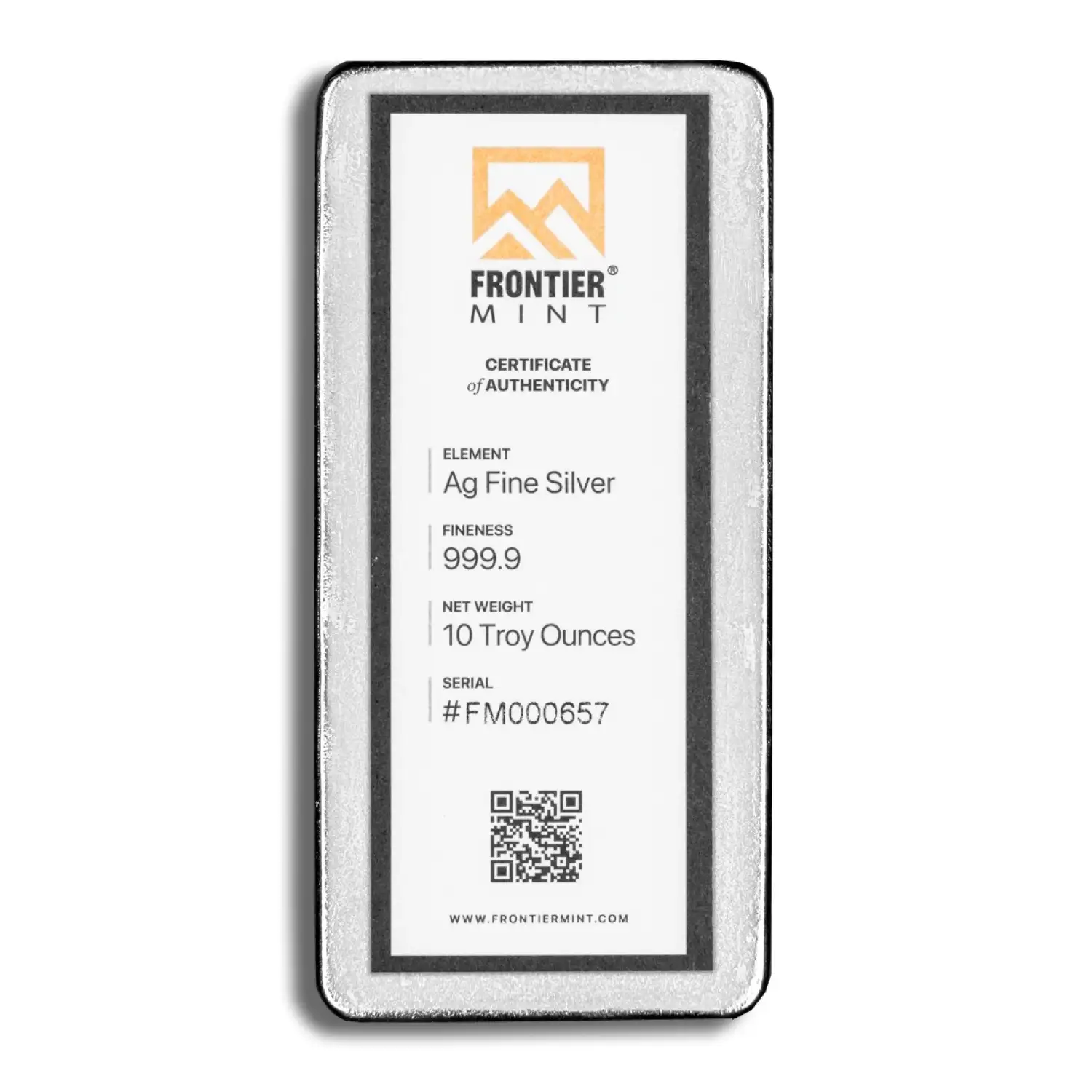 Introducing the impressive 10oz Frontier Mint Silver Bar, a must-have addition to any precious metal portfolio. Crafted with 99.9% pure silver, this bar is a symbol of enduring value and quality.