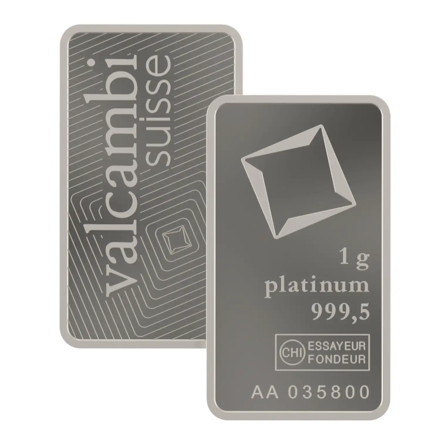 This 1g platinum bar features the iconic Valcambi logo on the obverse side, along with the weight and purity specifications. The reverse side of the bar displays a unique serial number for added authenticity and security.