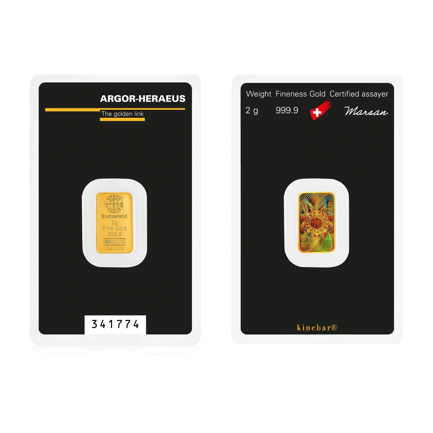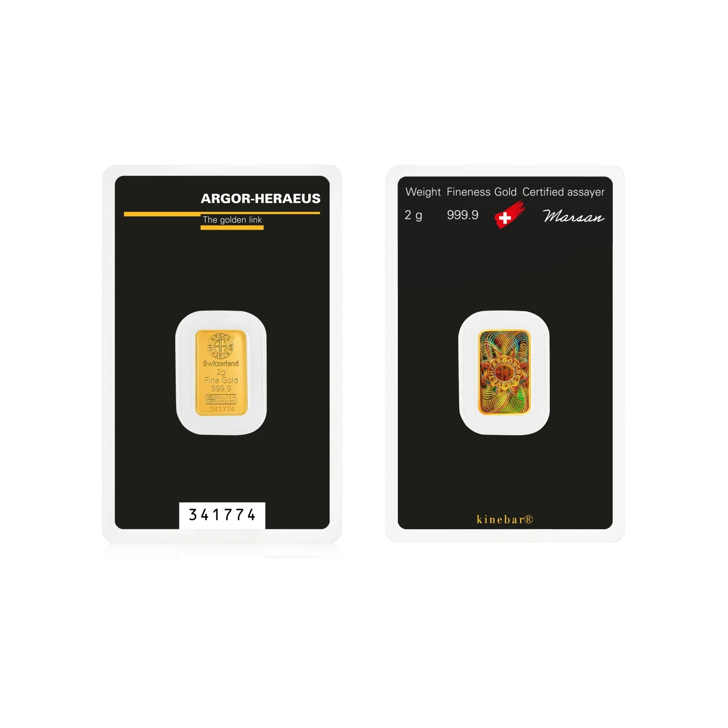 This exquisite 2g gold bar from Argor-Heraeus is not only a valuable investment but also a collector's item. The bar is stamped with the mint's logo, weight, and purity, ensuring its authenticity and quality. The Kinebar technology incorporated in the design gives the bar an additional layer of security, making it easy to authenticate.